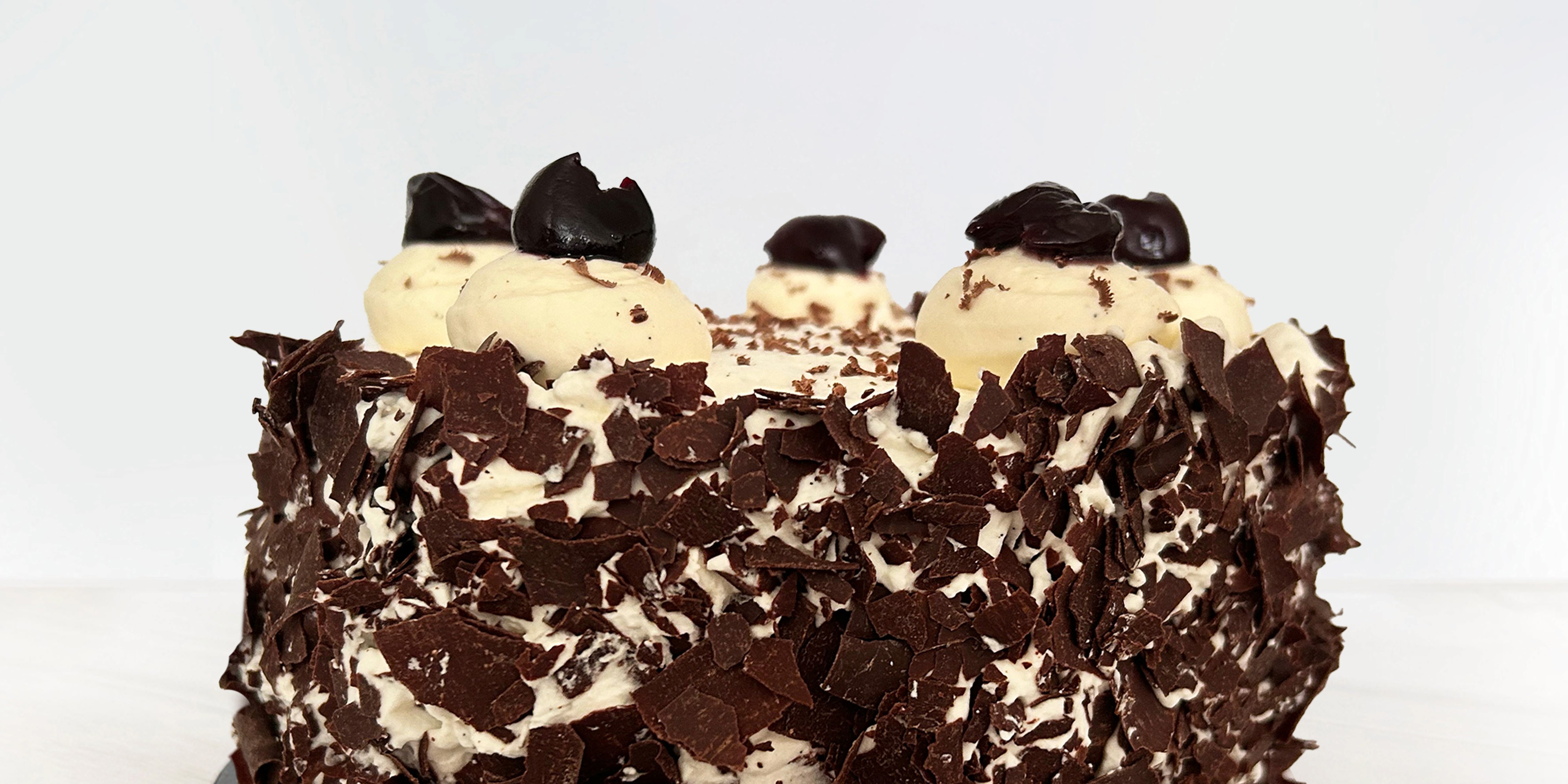 Découvrez notre Forêt Noire avec une génoise au cacao moelleuse, une crème onctueuse à la vanille et mascarponne, des cerises et griottes savoureuse, le tout parsemé de fins copeaux de chocolat.
